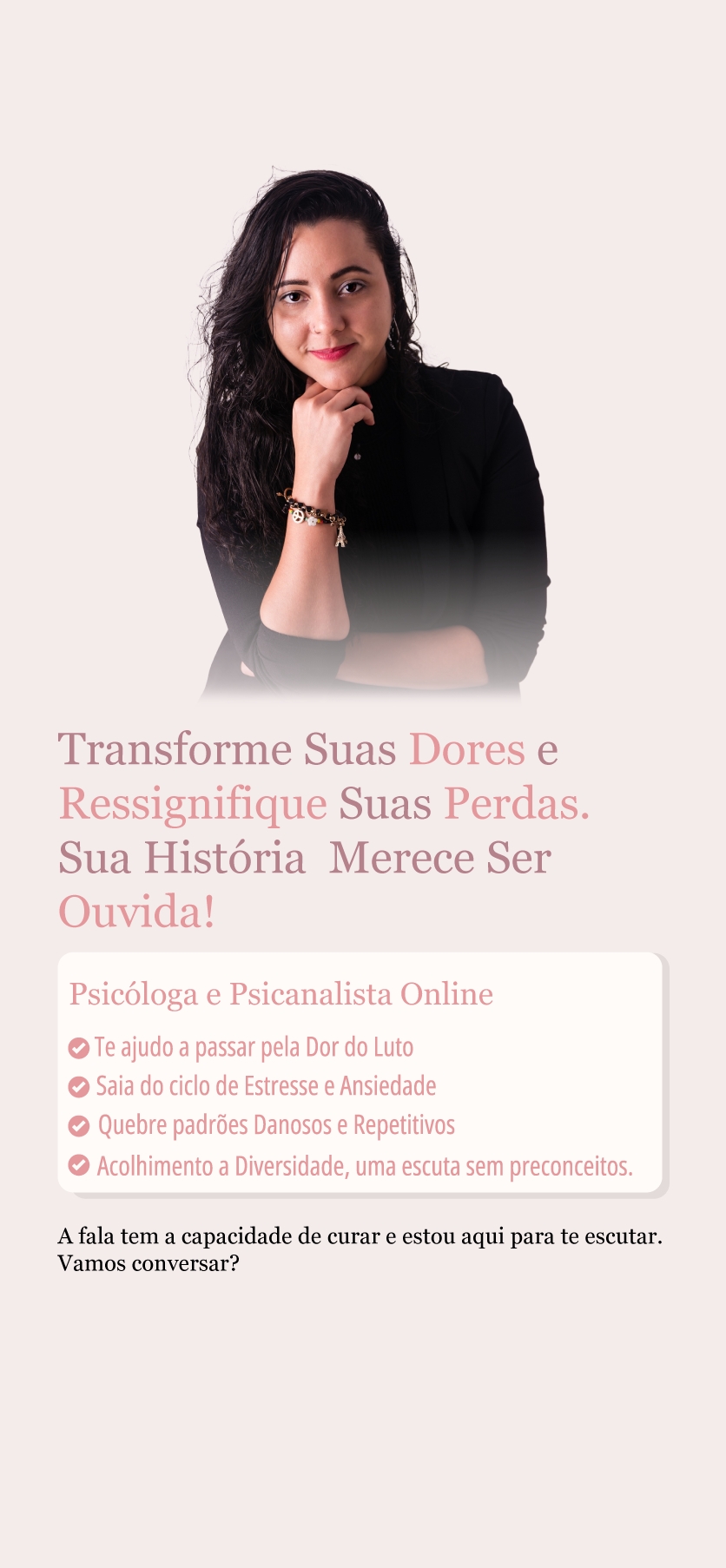 Cada perda, cada descoberta, cada desafio emocional — aqui, você encontra acolhimento e transformação. Luto, questões de identidade, traumas emocionais — não importa o que te trouxe até aqui, juntos(as) podemos encontrar um novo caminho. Entre perdas, angústia e desafios emocionais, há sempre um caminho para a cura e o recomeço.Gostaria de dizer que entendo que possa ser desconfortável iniciar o processo de Psicoterapia pois sei que falar sobre o que dói não é tão fácil, mas prometo fazer com que esse início seja da forma mais natural possível para você.